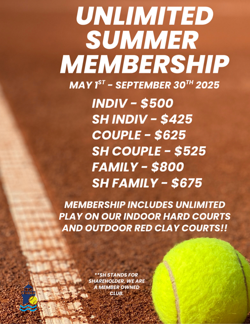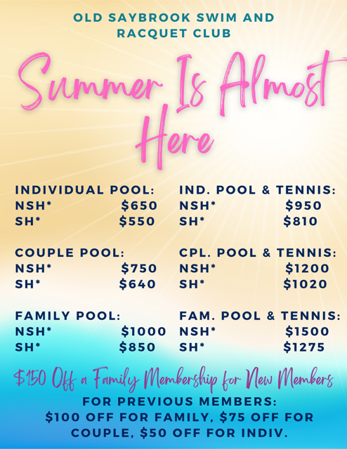We are so excited that summer is just around the corner!  Please see two membership offers going on now.  Call the club at 860 388 5115 or email Susan at susanriordan@oldsaybrookracquet.com with questions or to sign up today!!!