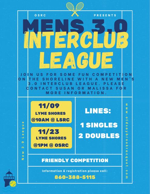 Happy Friday! We are so excited to announce our NEW men’s 3.0 tennis league. This league is designed to get players interested in playing fun, competitive tennis. Please contact Susan or Malissa if interested.